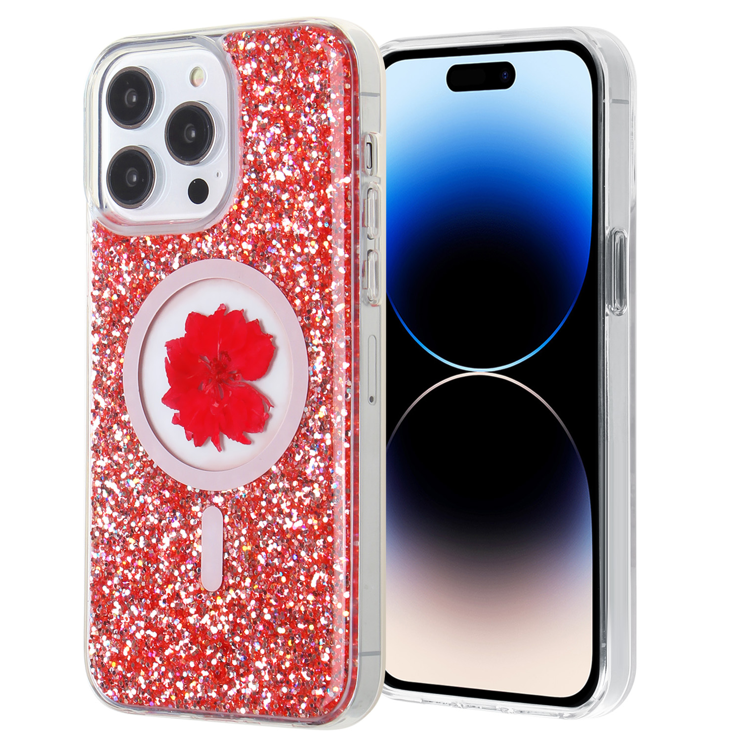For iPhone 14 ProMax Real Dry Flowers Phone Case TPU&hard PC - Epoxy Glitters with MagSafe Red F1¥ 0.00Buy now
