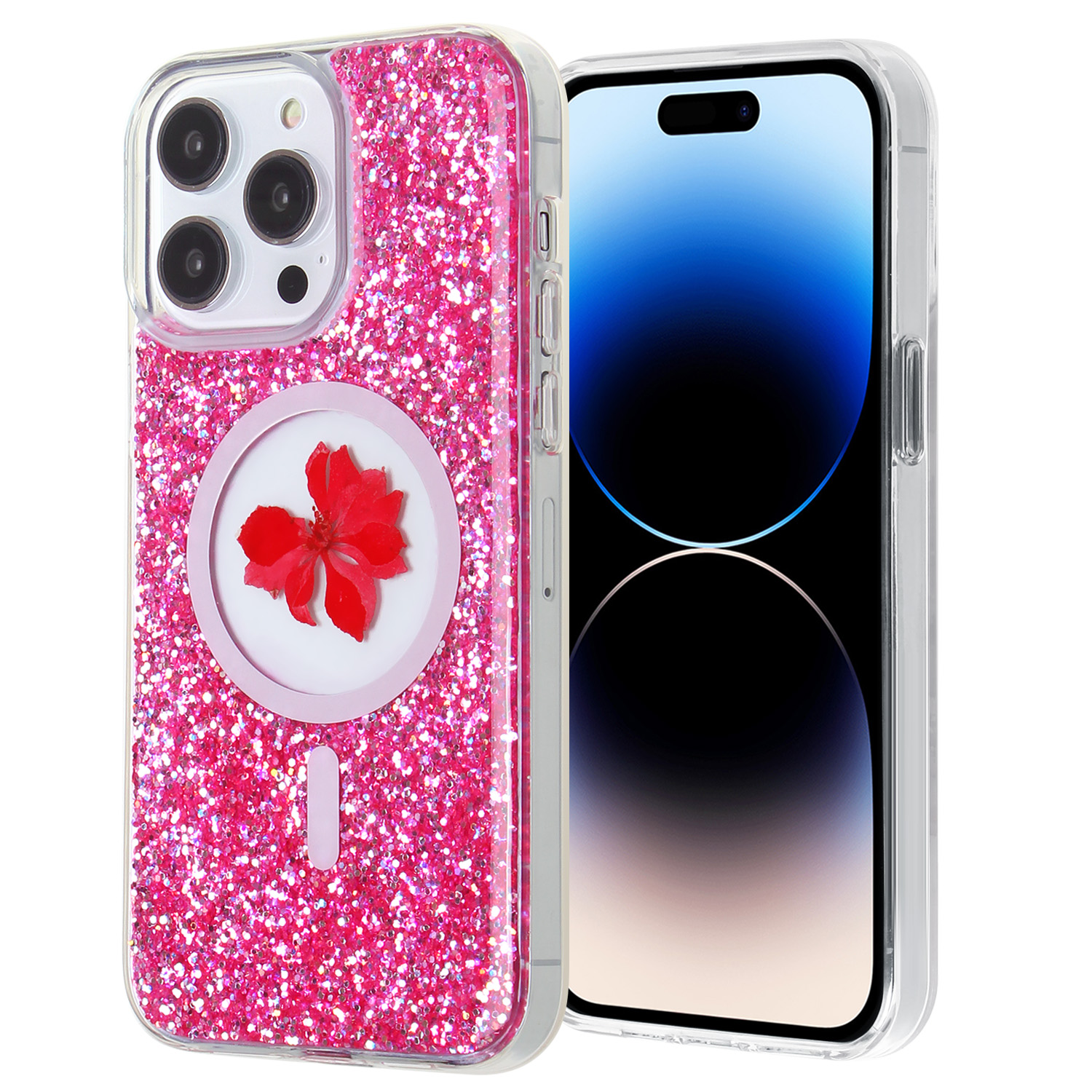 For iPhone 15 ProMax Real Dry Flowers Phone Case TPU&hard PC - Epoxy Glitters with MagSafe Hot Pink F2¥ 0.00Buy now