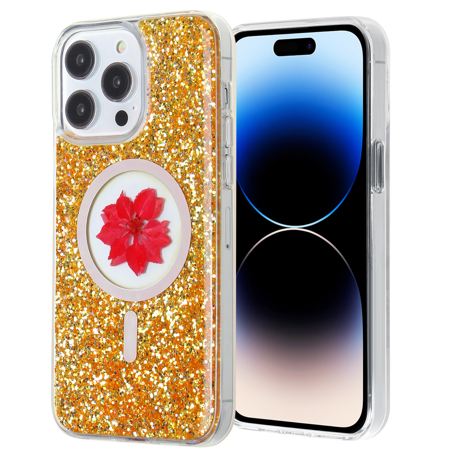 For iPhone 15 ProMax Real Dry Flowers Phone Case TPU&hard PC - Epoxy Glitters with MagSafe Gold F3¥ 0.00Buy now
